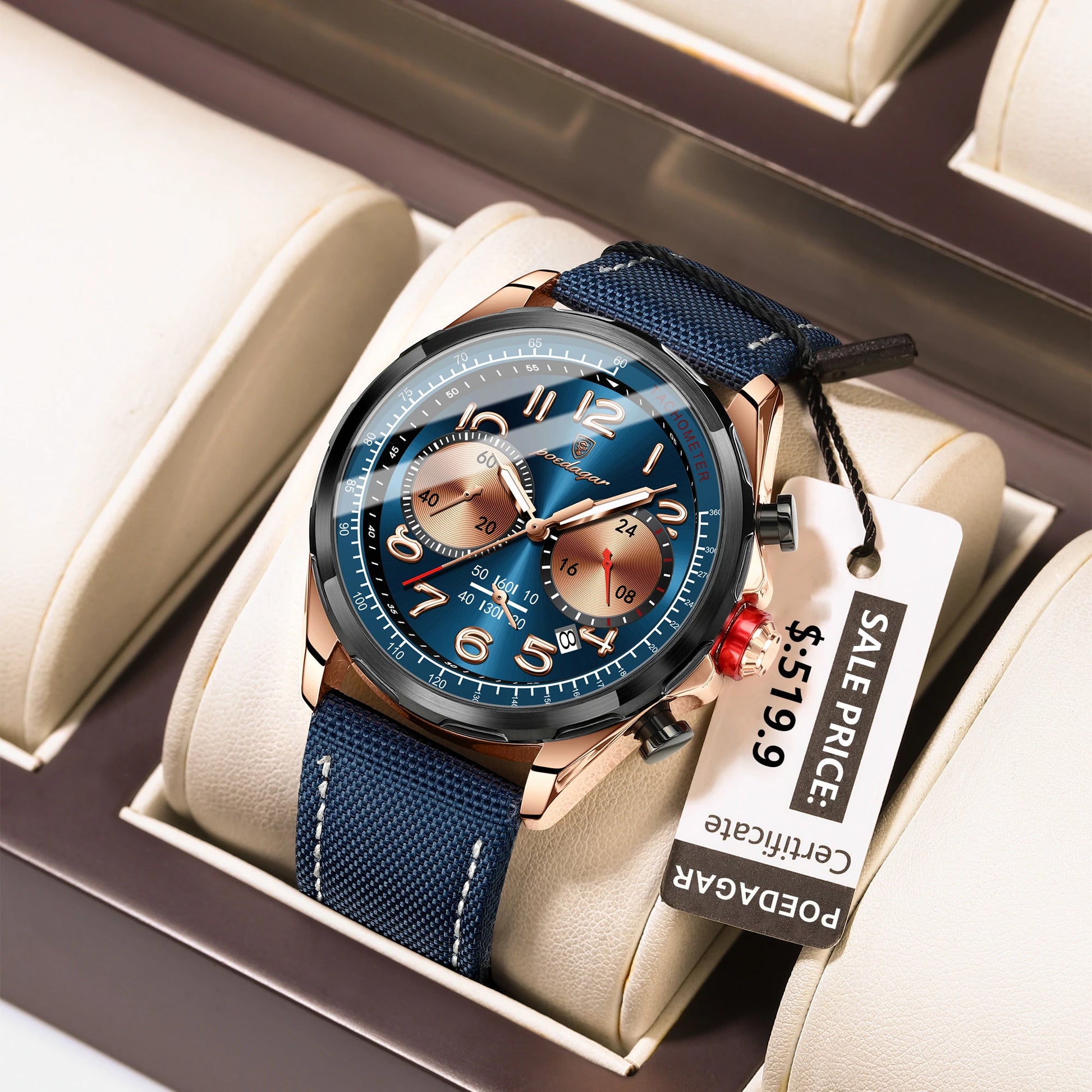 POEDAGAR Luxusuhr Herren Quarz Nylon Lederarmband Herren Armbanduhr Wasserdicht Leucht Chronograph Datum Herrenuhren Reloj + Box